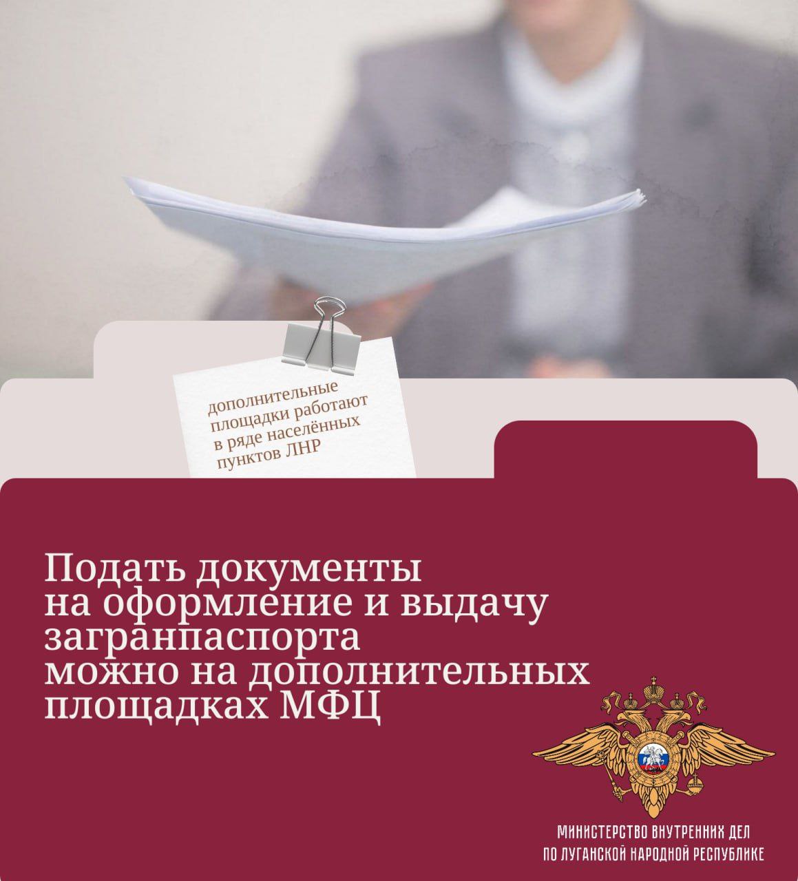Управление по вопросам миграции МВД по Луганской Народной Республике информирует жителей и гостей региона об организации дополнительного приёма заявлений на оформление и выдачу паспортов гражданина Российской Федерации, удостоверяющих личность гражданина РФ за пределами территории России (заграничный паспорт), на площадках Многофункционального центра предоставления государственных и муниципальных услуг.
