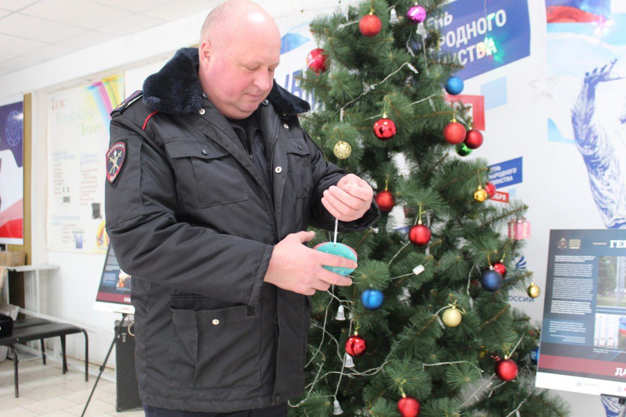 Начальник Отдела МВД России «Беловодский» подполковник полиции Николай Роговой вручил электронный синтезатор юному жителю Беловодска Егору. Своей мечтой мальчик поделился в рамках благотворительной акции «Ёлка желаний», а шар с загаданным снял с ёлки правоохранитель.