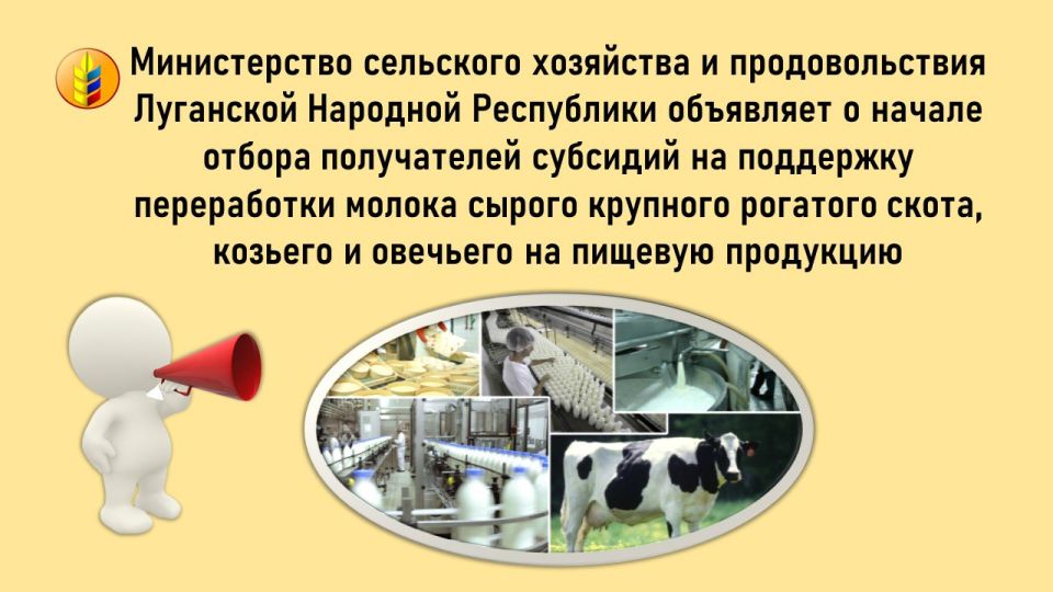 Министерство сельского хозяйства и продовольствия Луганской Народной Республики объявляет о начале приема заявок на субсидирование на поддержку переработки молока сырого крупного рогатого скота, козьего и овечьего на пищевую продукциюТип получателей: ...