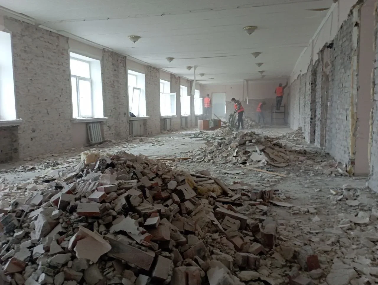 Сейчас здесь кипят демонтажные работы, после чего строители приступят к отделке внутренних помещений.