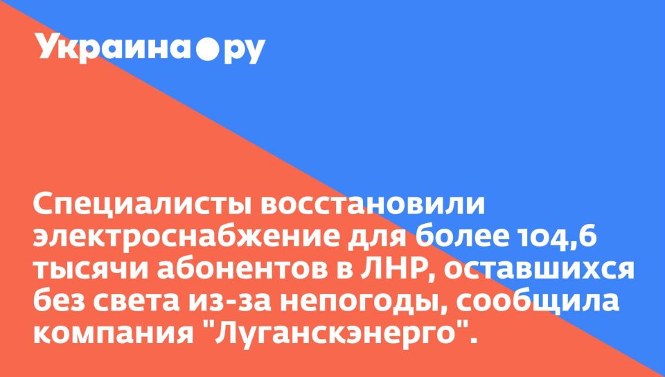 Специалисты восстановили электроснабжение для более 104,6 тысячи абонентов в ЛНР, оставшихся без света из-за непогоды, сообщила компания "Луганскэнерго".
