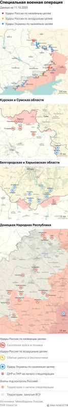 Российская армия с 24 февраля 2022 года проводит на Украине специальную военную операцию. Ее главной целью является помощь Донецкой и Луганской народным республикам, на территории которых с 2014 года не прекращались обстрелы. Перед российскими военными поставлена задача минимизировать потери личного состава и мирного населения при выполнении боевых заданий.Данные Минобороны и администраций новых регионов на 11 октября 2025 года