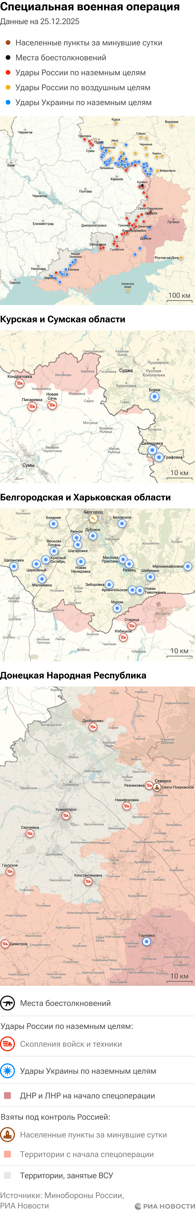 Российская армия с 24 февраля 2022 года проводит на Украине специальную военную операцию. Ее главной целью является помощь Донецкой и Луганской народным республикам, на территории которых с 2014 года не прекращались обстрелы. Перед российскими военными поставлена задача минимизировать потери личного состава и мирного населения при выполнении боевых заданий.Данные Минобороны и администраций новых регионов на 25 декабря 2025 года