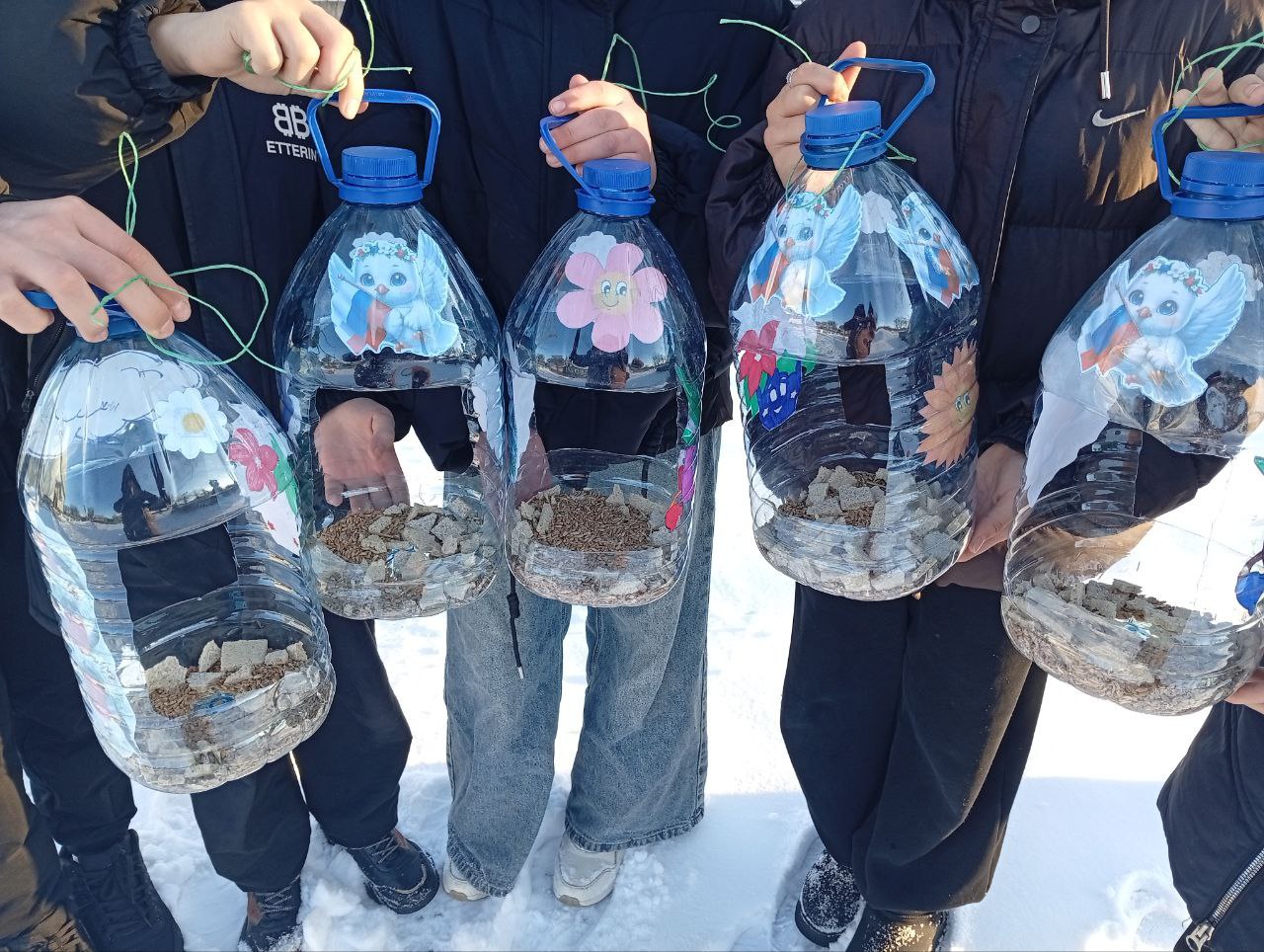 Сильные морозы и снег затрудняют им поиск корма. Поэтому юные артисты изготовили из пластиковой тары кормушки и развесили их в местах обитания птиц. Такие акции решено проводить регулярно в зимнее время года.