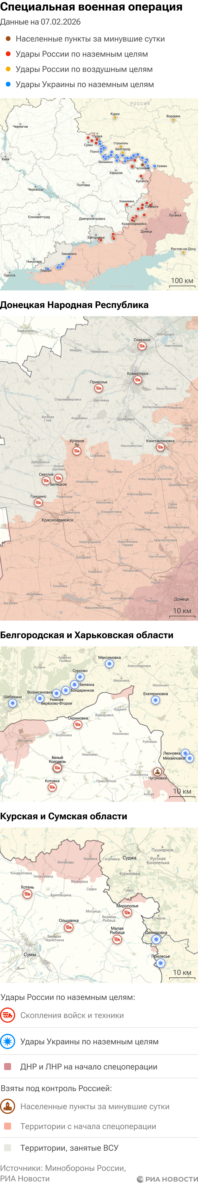 Российская армия с 24 февраля 2022 года проводит на Украине специальную военную операцию. Ее главной целью является помощь Донецкой и Луганской народным республикам, на территории которых с 2014 года не прекращались обстрелы. Перед российскими военными поставлена задача минимизировать потери личного состава и мирного населения при выполнении боевых заданий.Данные Минобороны и администраций новых регионов на 7 февраля 2026 года