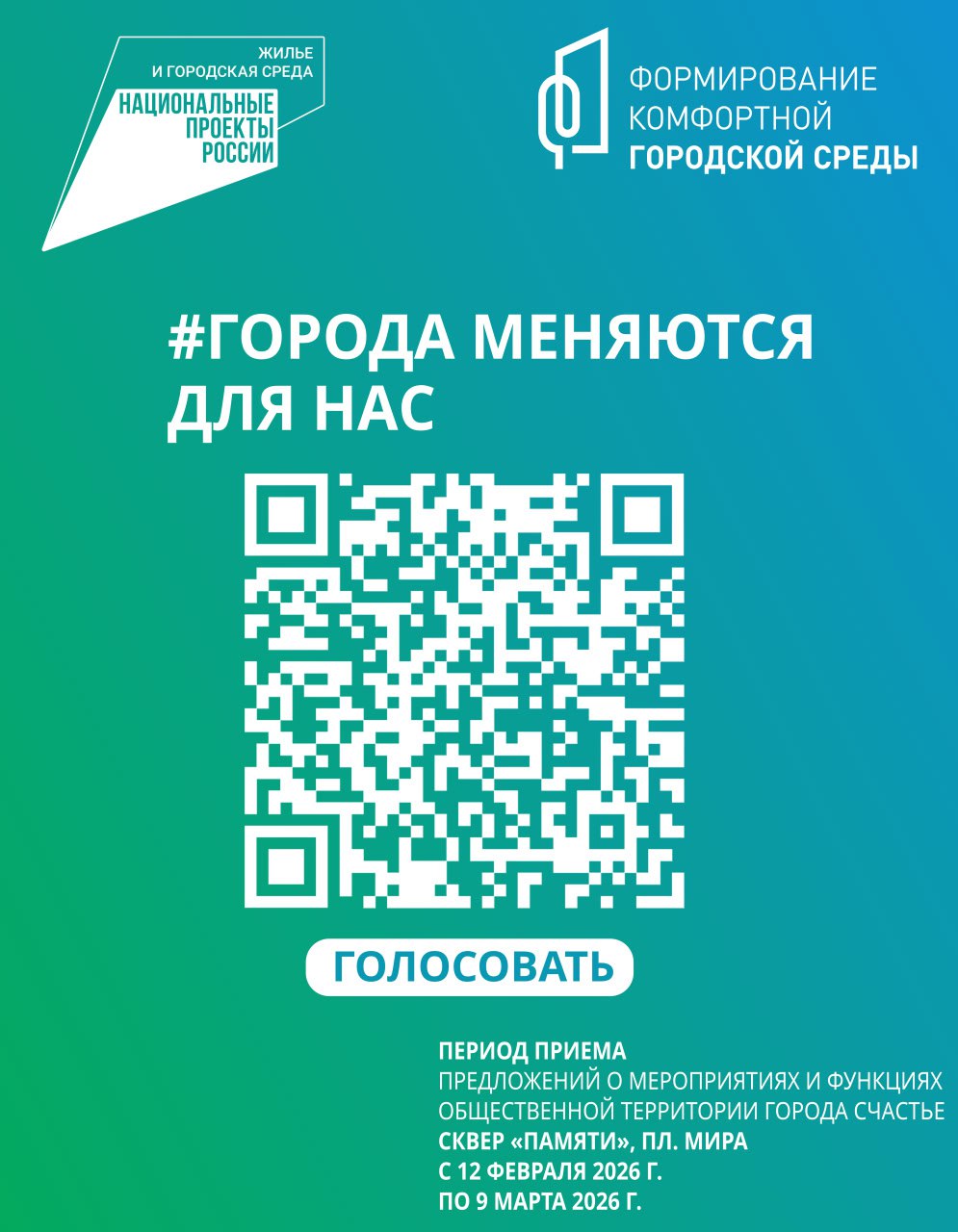 Администрация Луганска объявляет о начале сбора предложений от жителей города Счастье по наполнению общественной территории, которая примет участие во Всероссийском конкурсе лучших проектов создания комфортной городской среды, реализация которых запланирована на 2027–2028 годы.