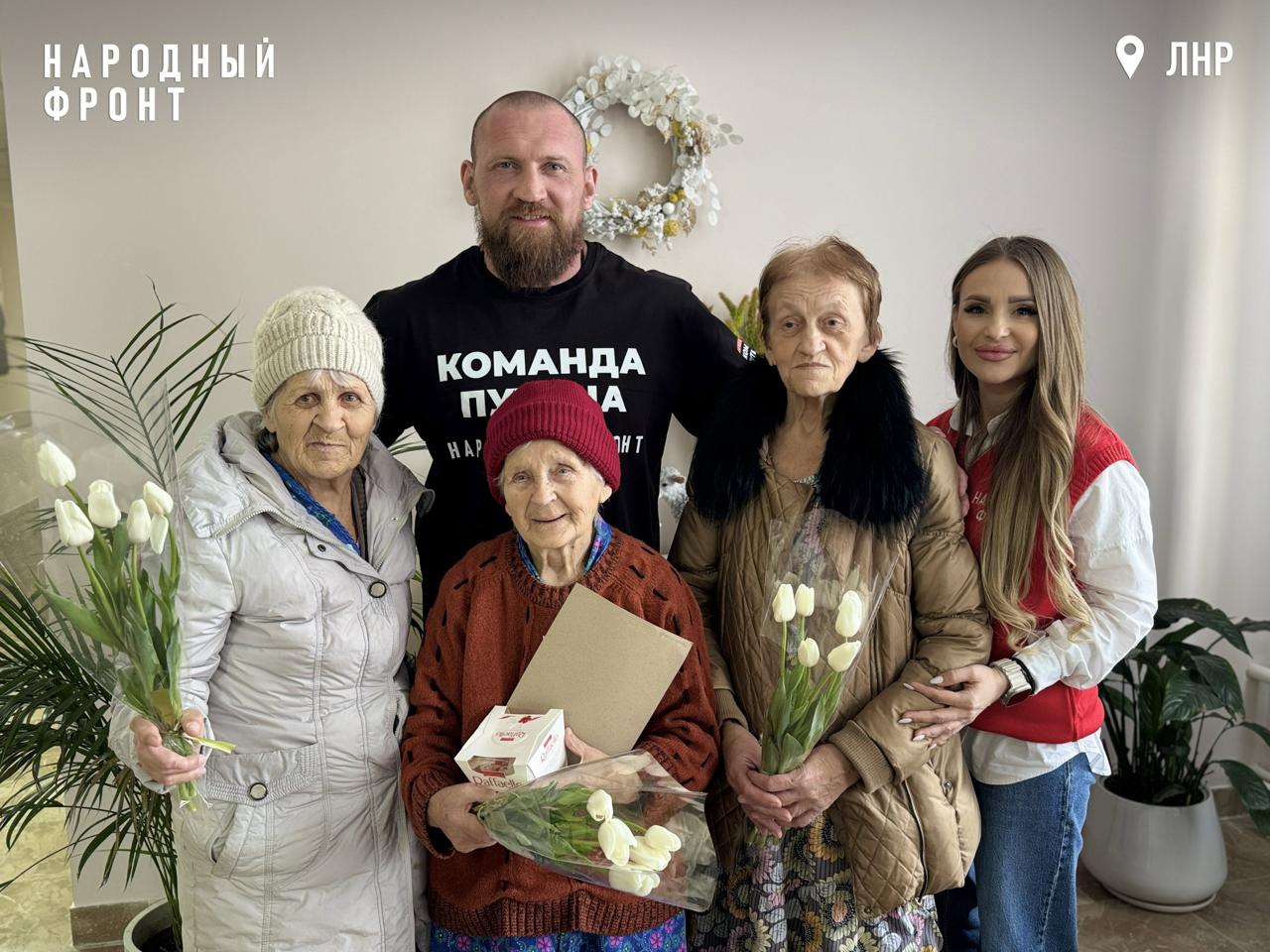 Первая остановка – богадельня. Здесь каждой пожилой женщине участник "Команды Путина" вручил тюльпаны и сладости, пожелал здоровья и подарил самое главное – объятия, частички заботы и любви.