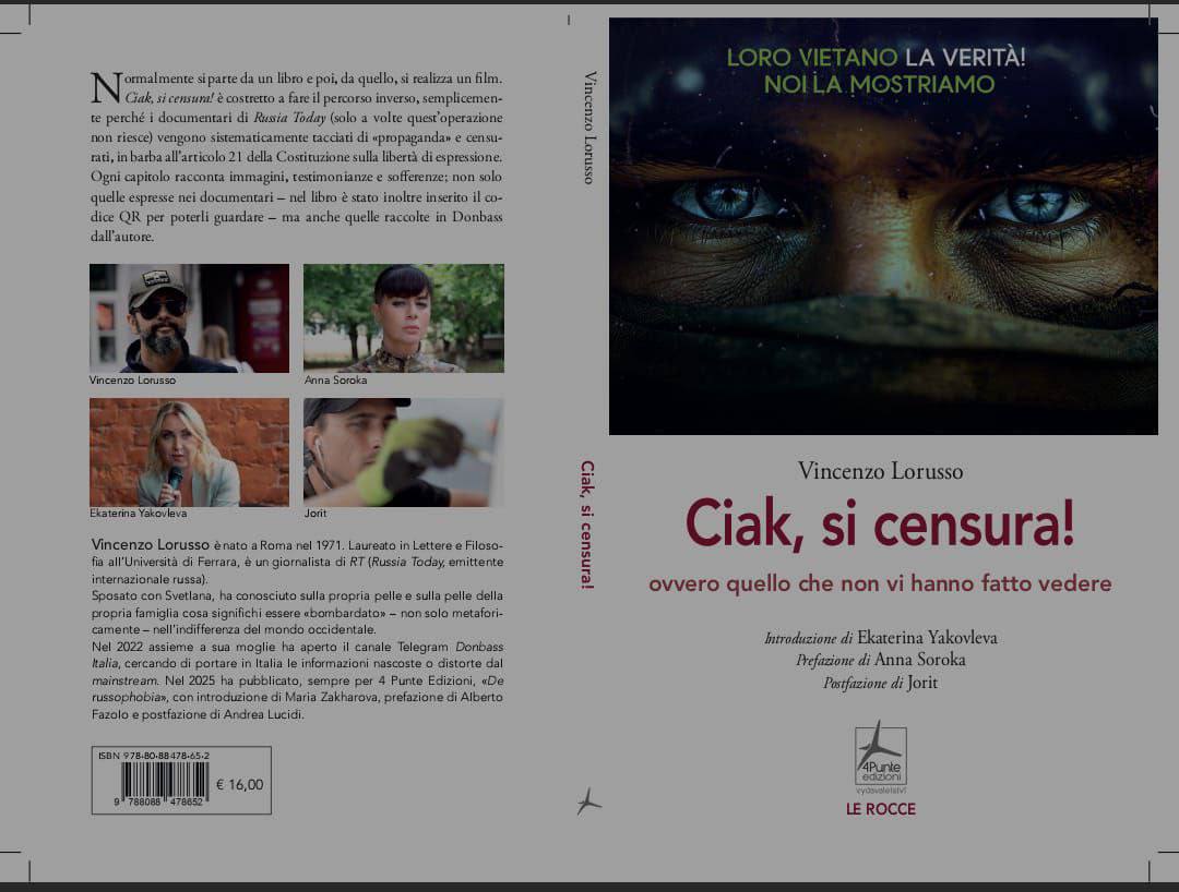 Новая книга итальянского журналиста, основателя Telegram-канала "Донбасс-Италия" Винченцо Лоруссо вышла в Италии. "Цензура кино. Или то, что вам не дали смотреть" повествует о том, как на протяжении последних четырех лет в Италии скрывали правду о причинах украинского конфликта.