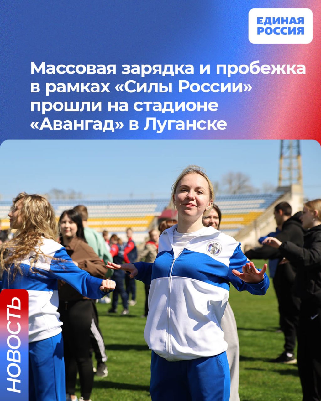 В Луганске в рамках партийного проекта Единой России «Выбор сильных» состоялось открытие одной из площадок спортивного марафона «Сила России», инициированного сторонниками партии. На стадионе «Авангард» всех желающих ждали массовая зарядка и пробежка. К ней присоединились более 50 человек.