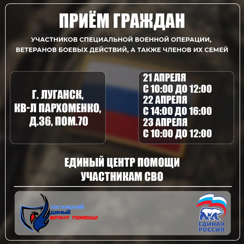 В Луганске 21–23 апреля пойдут приёмы участников СВО, ветеранов и членов их семей
