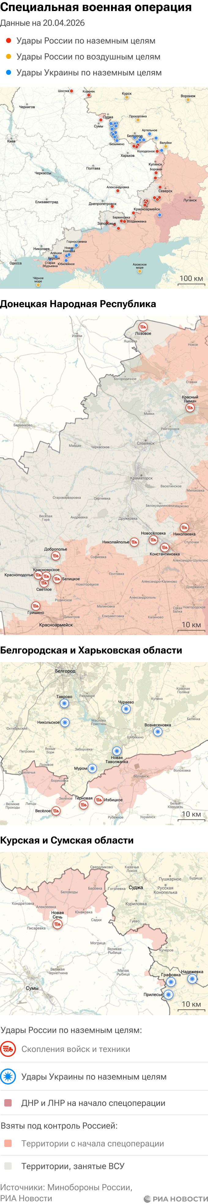 Российская армия с 24 февраля 2022 года проводит на Украине специальную военную операцию. Ее главной целью является помощь Донецкой и Луганской народным республикам, на территории которых с 2014 года не прекращались обстрелы. Перед российскими военными поставлена задача минимизировать потери личного состава и мирного населения при выполнении боевых заданий.Данные Минобороны и администраций новых регионов на 20 апреля 2026 года