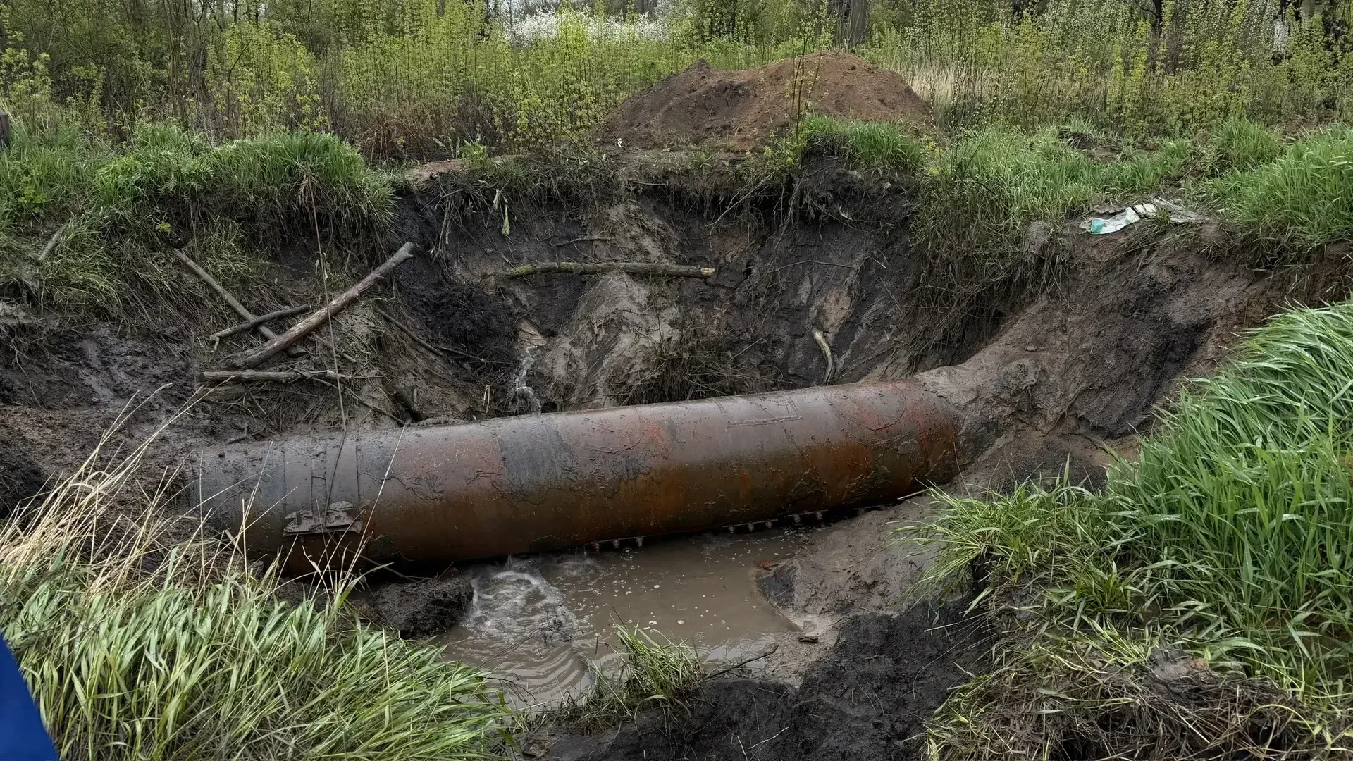 Чтобы добраться к месту аварии, рабочие вручную проложили временную дорогу из веток. Воду обещают дать вечером 21 апреля.