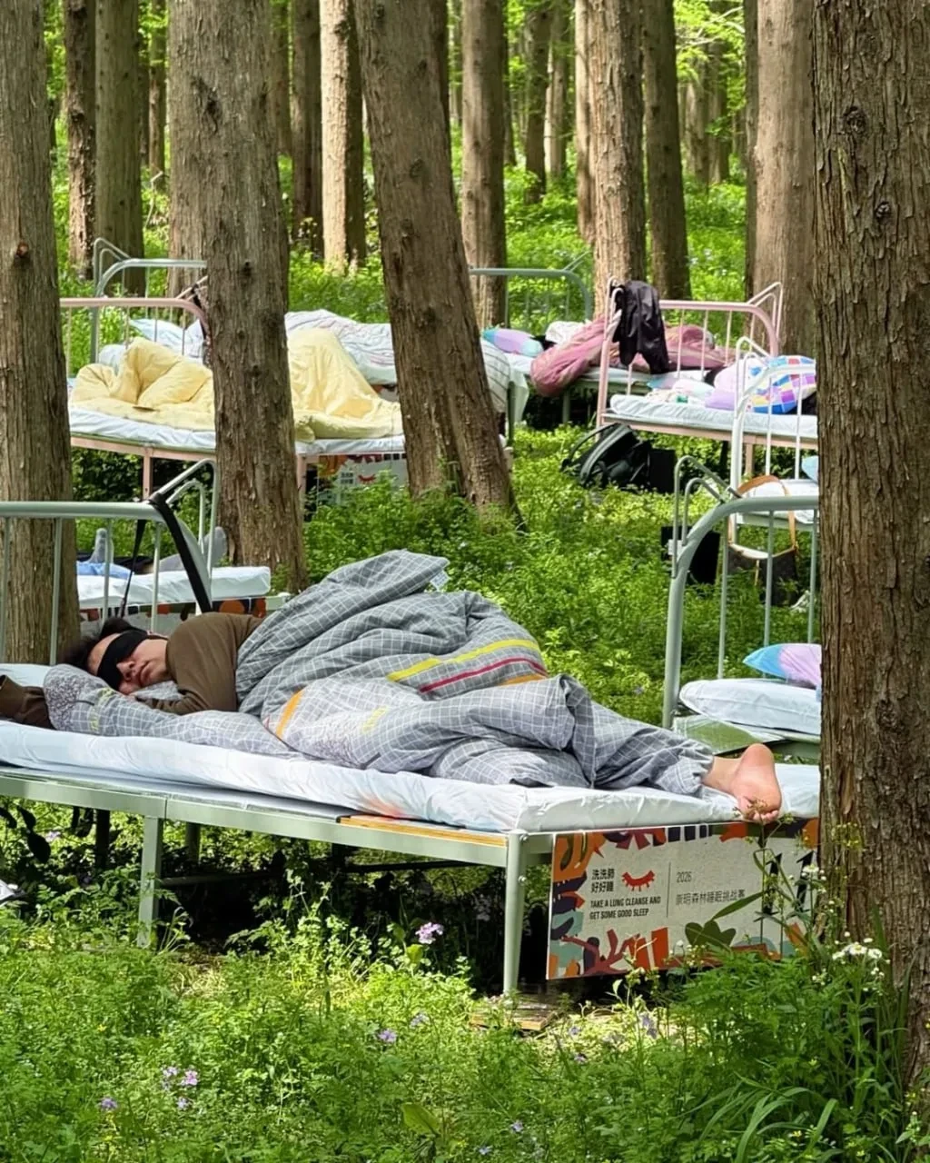 Участников набралось больше 400. Организаторы поставили кровати прямо в Национальном парке Дунпин. Задача участников — пролежать 7 часов. Никаких телефонов, разговоров и даже походов в туалет — за это дисквалифицируют.