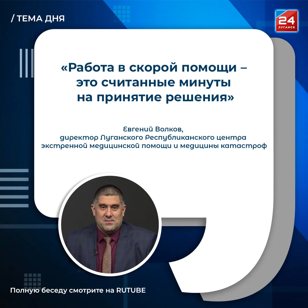 В День работника скорой медицинской помощи в студии программы «Тема дня» пообщались с Евгением Волковым, директором Луганского Республиканского центра экстренной медицинской помощи и медицины катастроф.